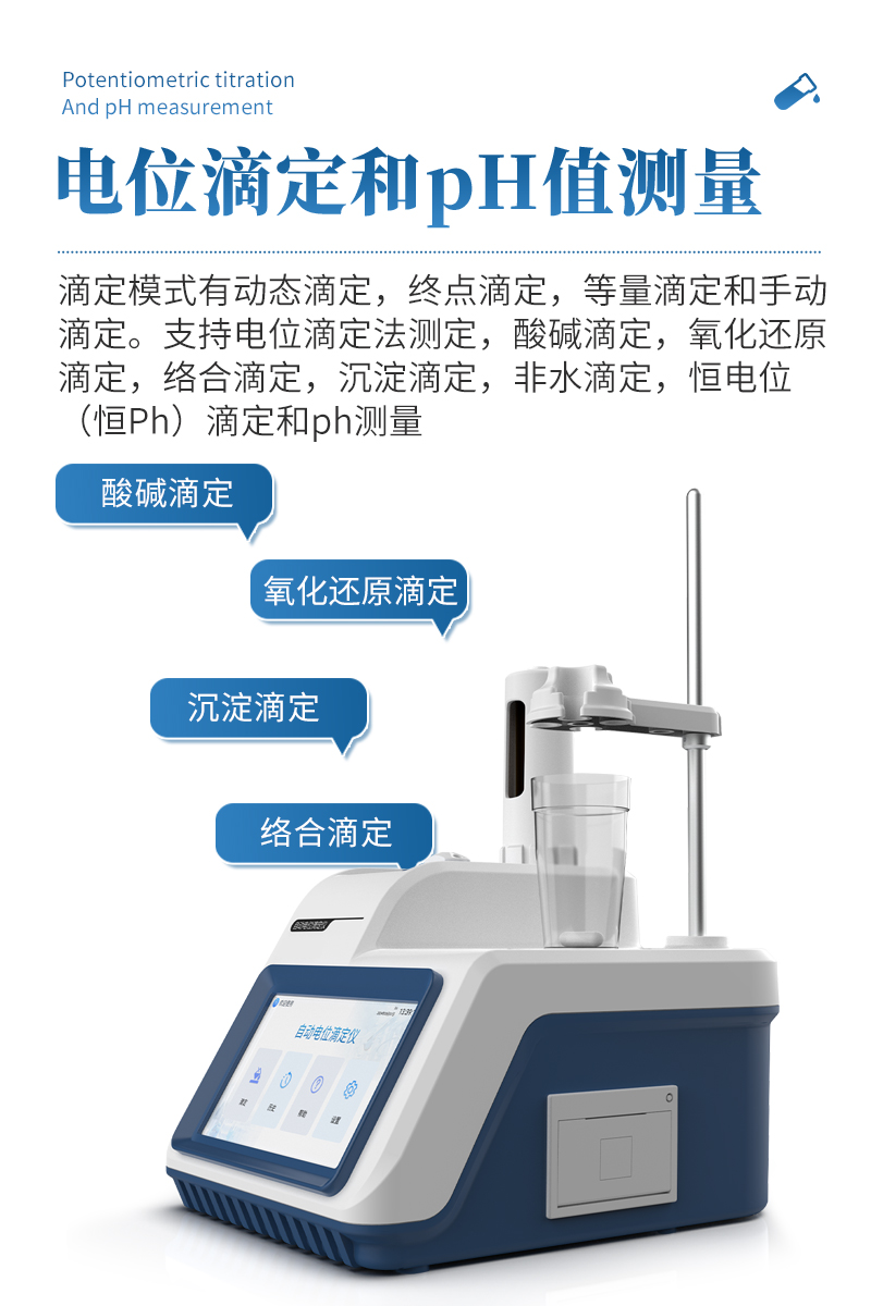 自動(dòng)電位滴定儀是一種用于化學(xué)分析的精密儀器,他通過自動(dòng)添加滴定劑來確定樣品中特定成分的濃度。該儀器基于電位滴定原理工作,即根據(jù)在滴定過程中電池電動(dòng)勢(shì)的變化來確定滴定終點(diǎn)的一款滴定設(shè)備。設(shè)備滿足國(guó)家檢定規(guī)程JJG 814-2015《自動(dòng)電位滴定儀》儀器級(jí)別中的0.05級(jí)別,即儀器**示值誤差為±1.5%,儀器示值重復(fù)性≤0.2%