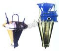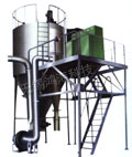 空氣經(jīng)過濾和加熱,進(jìn)入干燥器頂部空氣分配器,熱空氣呈螺旋狀均勻地進(jìn)入干燥室。料液經(jīng)塔體頂部的高速離心霧化器,(旋轉(zhuǎn))噴霧成細(xì)微的霧狀液珠,與熱空氣并流接觸在短的時間內(nèi)可干燥為成品。成品連續(xù)地由干燥塔底部和旋風(fēng)分離器中輸出,廢氣由風(fēng)機排空。