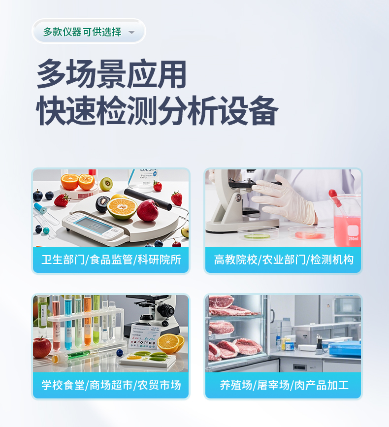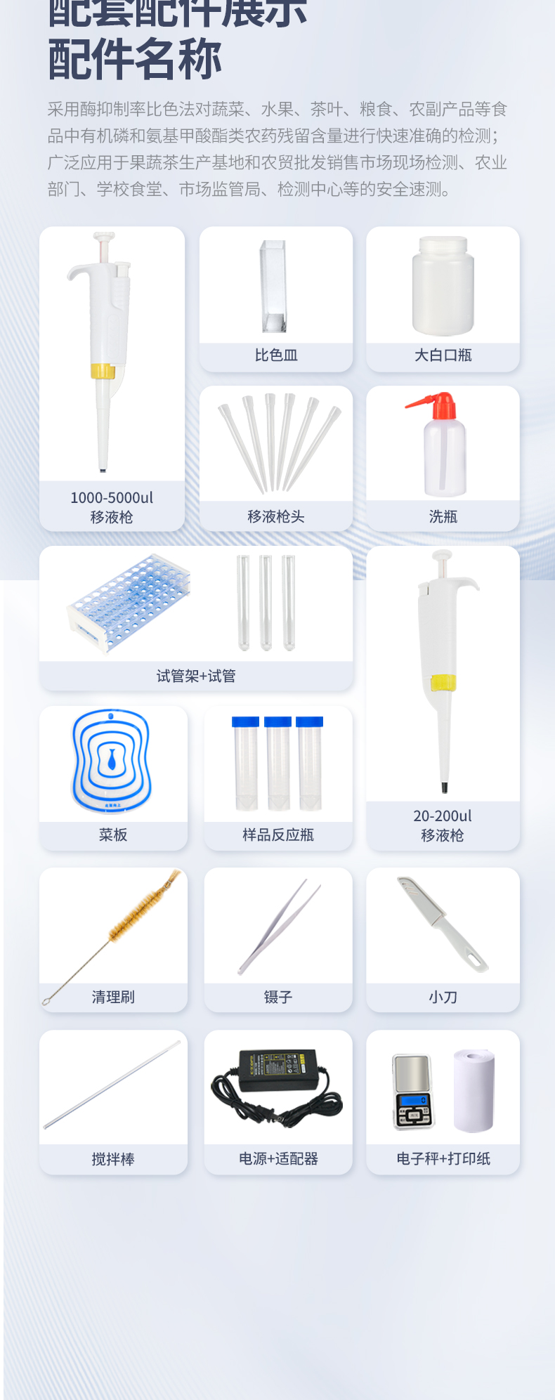 采用酶抑制率比色法對蔬菜、水果、茶葉、糧食、農副產品等食品中有機磷和氨基甲酸酯類農藥殘留含量進行快速準確的檢測;廣泛應用于果蔬茶生產基地和農貿批發銷售市場現場檢測、農業部門、學校食堂、市場監管局、檢測中心等的安全速測。
