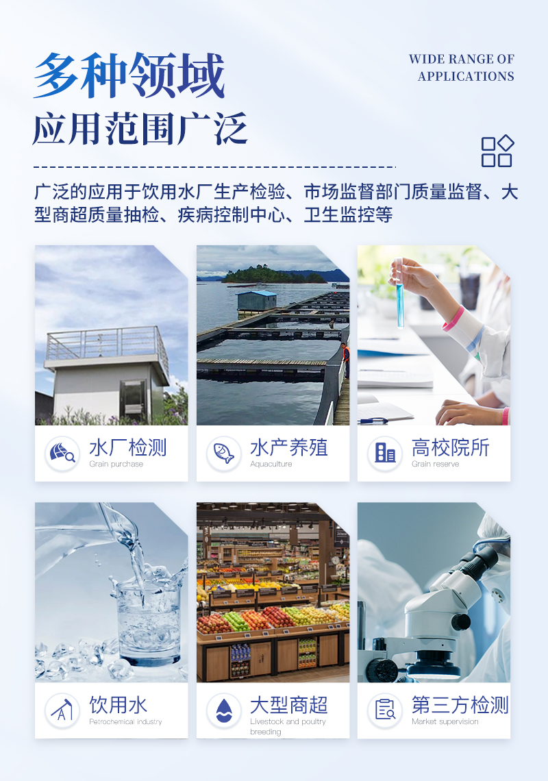 能夠廣泛的應(yīng)用于飲用水廠生產(chǎn)檢驗(yàn)、市場(chǎng)監(jiān)督部門質(zhì)量監(jiān)督、大型商超質(zhì)量抽檢、疾病控制中心、衛(wèi)生監(jiān)控等。