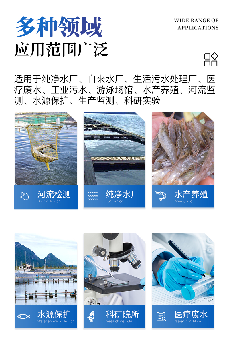 適用于純凈水廠、自來(lái)水廠、生活污水處理廠、**廢水、工業(yè)污水、游泳場(chǎng)館、水產(chǎn)養(yǎng)殖、河流監(jiān)測(cè)、水源保護(hù)、生產(chǎn)監(jiān)測(cè)、科研實(shí)驗(yàn)等。