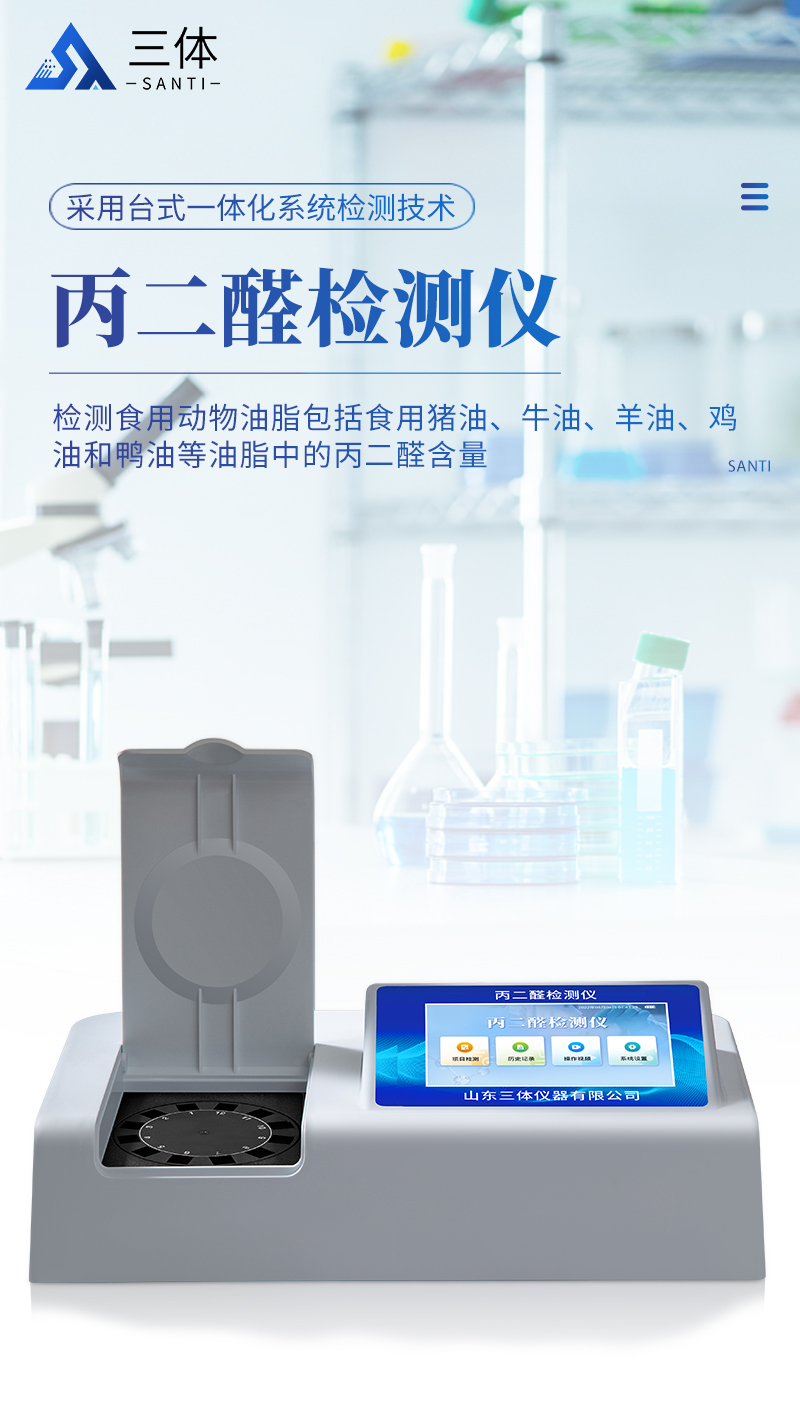 山東三體儀器有限公司生產(chǎn)的丙二醛檢測儀為集成化食品安全快速檢測分析設(shè)備,采用臺式一體化設(shè)計(jì),能夠快速檢測食用動物油脂包括食用豬油、牛油、羊油、雞油和鴨油等油脂中的丙二醛含量;儀器預(yù)留其他項(xiàng)目檢測程序和端口,根據(jù)日后需求可進(jìn)行遠(yuǎn)程升級
