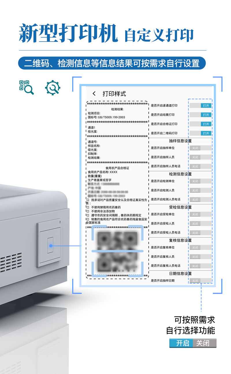 9.7.1、全新打印系統:內置全新打印機,新創自定義打印方式,可按需靈活勾選控制:二維碼,抽樣信息、檢測信息,受檢信息、復核信息、抽樣日期、檢測日期等信息的打印。